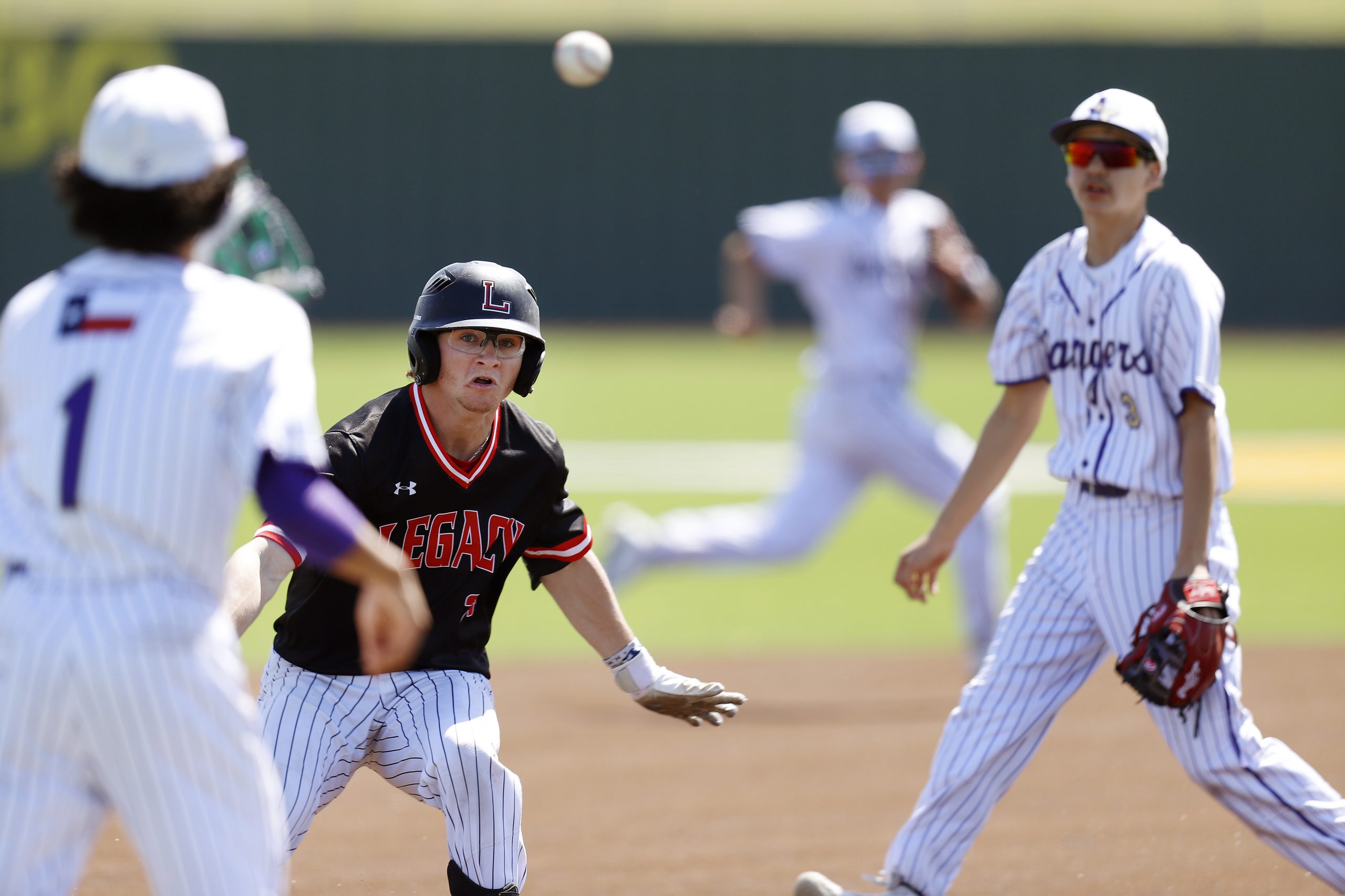 - InstructorPortfolioRachel DearingerMansfield Legacy High SchoolMansfield, TXCaption:With his eyes on the third baseman, Eli Dugan, 11, works to get out of a pickle in the pre-season game against Chisholm Trail on March 17, 2025. Legacy JV won the game, 9-0.